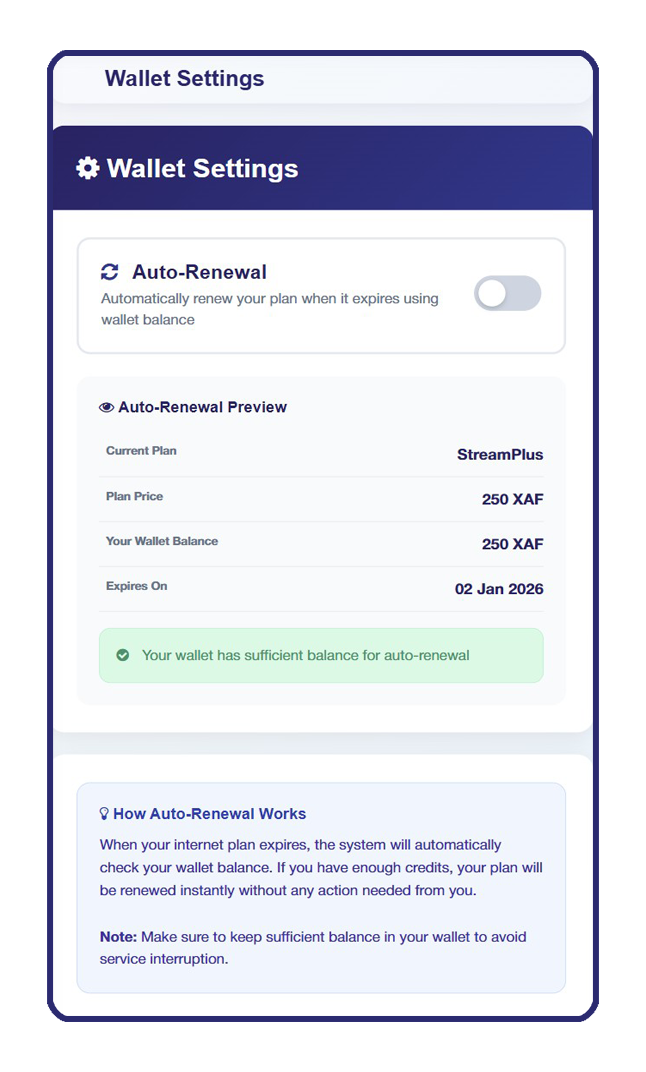 Top up your Solid Wave wallet easily using MTN Mobile Money or Orange Money, and enable automatic subscription renewal to stay connected without interruptions.