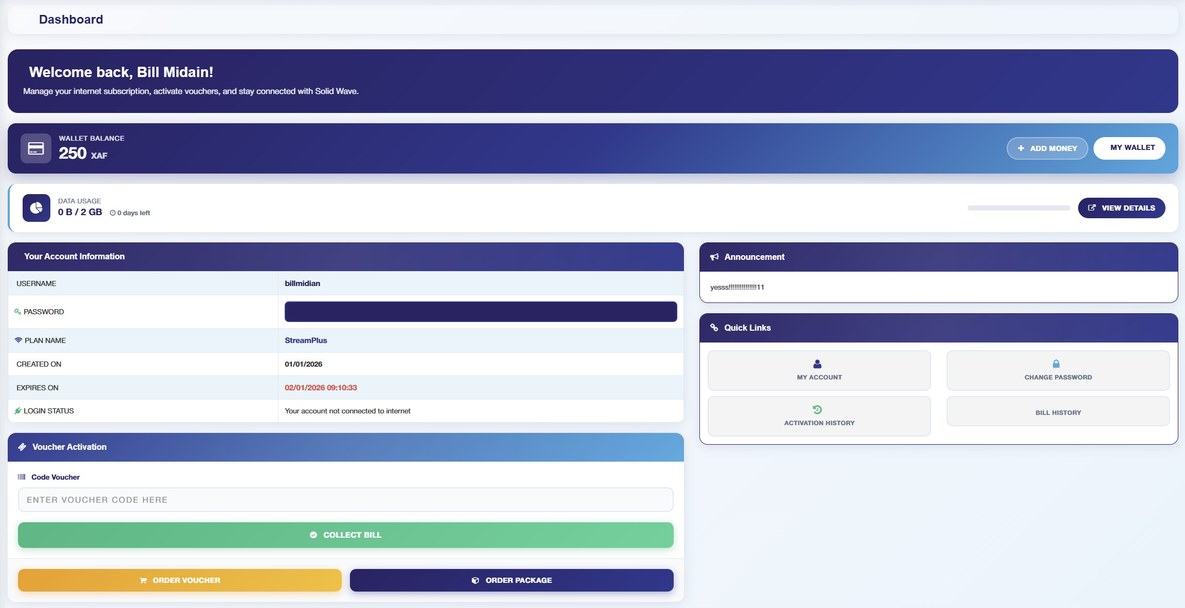 Solid Wave includes a smart wallet that lets you top up your account, enable automatic subscription renewal from your wallet settings, and view your full transaction history, all in one place for easy, uninterrupted internet access.